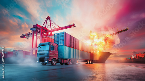 Container truck in ship port for business Logistics and transportation of Container Cargo ship and Cargo plane with working crane bridge in shipyard at sunrise, logistic import export and transport