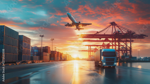 Container truck in ship port for business Logistics and transportation of Container Cargo ship and Cargo plane with working crane bridge in shipyard at sunrise, logistic import export and transport
