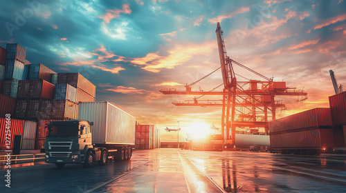 Container truck in ship port for business Logistics and transportation of Container Cargo ship and Cargo plane with working crane bridge in shipyard at sunrise, logistic import export and transport