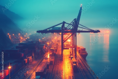 Containers and cranes at a busy port during twilight with foggy atmosphere and glowing lights reflecting on the water