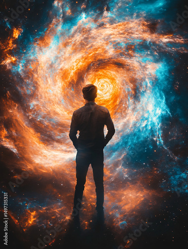 Contemplating the Cosmos: A lone figure stands silhouetted, gazing at a mesmerizing swirling nebula, a vast, vibrant tapestry of celestial beauty and cosmic wonder.