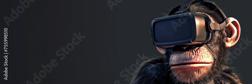 Contemplative chimpanzee with virtual reality headset against dark background, virtual discovery concept