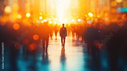 Contemplative figure walking alone on a sunlit path amidst a blurred crowd, symbolizing individuality and purpose, conveying hope, focus, and connection in a journey of self-discovery.