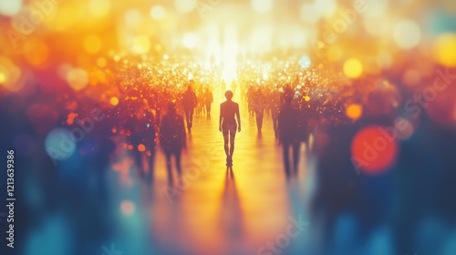 Contemplative figure walking alone on a sunlit path amidst a blurred crowd, symbolizing individuality and purpose, conveying hope, focus, and connection in a journey of self-discovery.