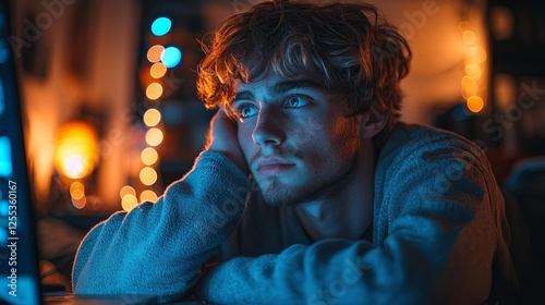 Contemplative youth engaged in digital screen home environment emotional portrait nighttime introspective mood