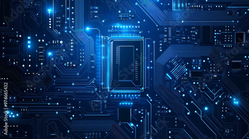 Contemporary circuit board texture for background design, focusing on quantum computing and extensive data processing. Includes a sleek blue circuit board with a minimalist vector motherboard.