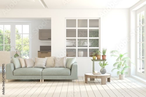 Contemporary classic white interior with furniture and decor and summer landscape in window. Scandinavian interior design. 3D illustration