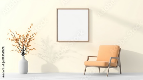 Contemporary interior design with armchair, vase, and mock-up frame in 3D rendering