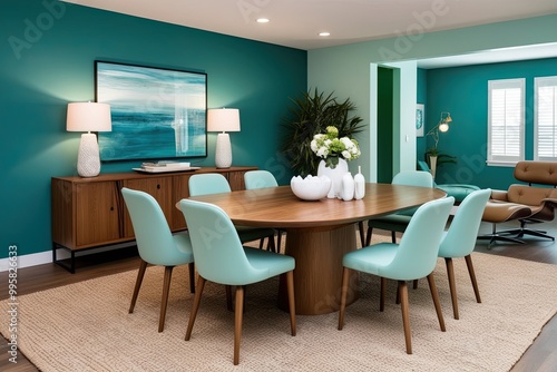 Contemporary Living Space with Teal Walls Featuring Seafoam Chairs Oval Oak Dining Table and Lounge Chair