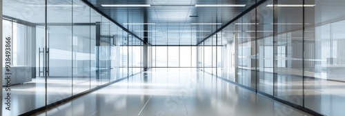 Contemporary office corridor featuring clear glass walls and doors.