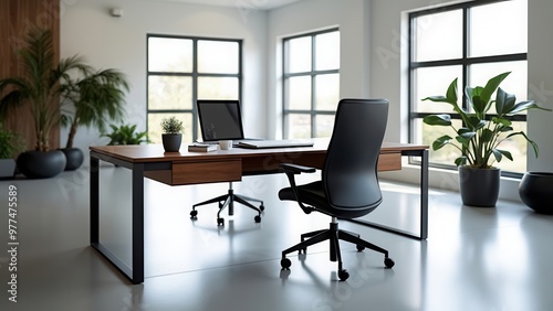 Contemporary office space featuring a modern desk paired with an ergonomic chair, complemented by indoor plants and natural light, creating an airy, refreshing, and productive work environment.