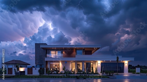 contemporary suburban home during a thunderstorm, capturing the dramatic contrast between its modern structure and the dynamic weather