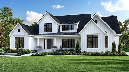 Contemporary white home with clean lines, lush lawn, and manicured plants, under a vivid blue sky, front-facing view, crisp and detailed composition.