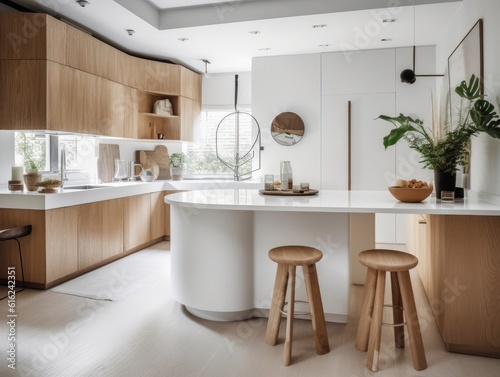 Contemporary wooden dining room and kitchen. Generative AI
