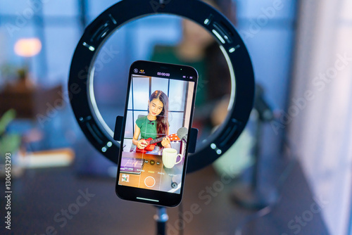 Content creator Young asian woman influencer creating content in home studio entertainment and communication blogger video record with smartphone for online vlog