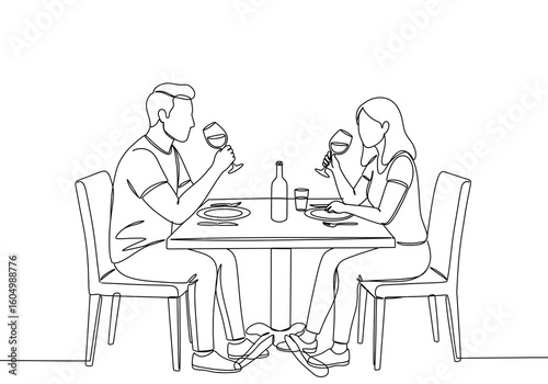 Continuous line drawing of a couple dining with wine glasses at a restaurant table