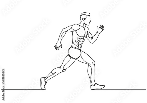 Continuous line drawing of a muscular man running with defined abs and arm muscles on white