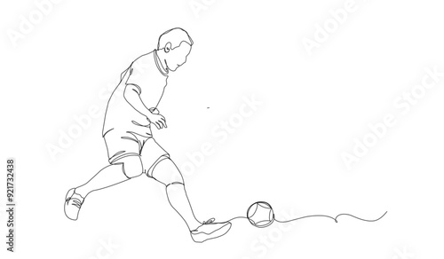 continuous line drawing of soccer player shooting vector illustration. Single one line art of young man playing soccer ball template.