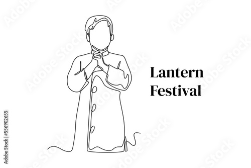 Continuous one line drawing happy boy Dressed in a Chinese Costume gives greeting. Lantern festival concept. Single line draw design vector graphic illustration.