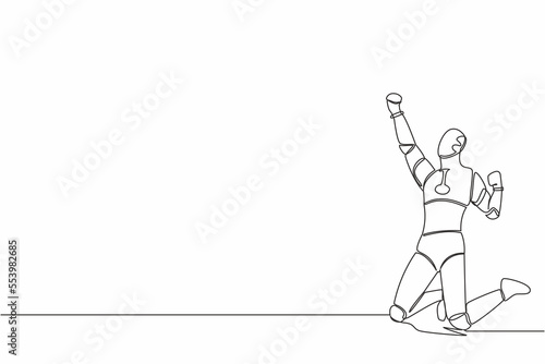 Continuous one line drawing happy robot kneeling with raised one hand high and raised other. Humanoid cybernetic organism. Future robot development. Single line draw graphic design vector illustration