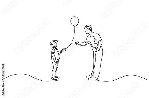 Continuous one line drawing of Father giving balloon. Single line drawing illustration of Father giving balloon for his boy. Happy family concept vector art. Doodle line illustration.