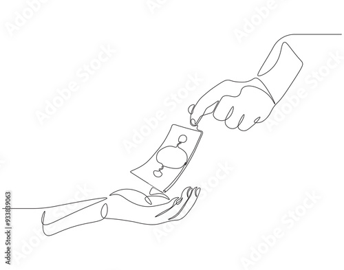 Continuous one line drawing of hand giving money to another hand. One line drawing illustration of hand giving and receive money. World giving day, concept line art. Editable outline.