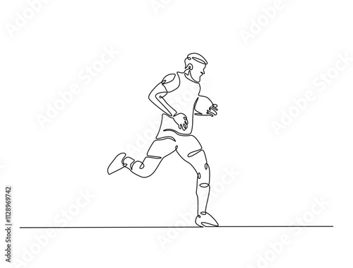 Continuous one line drawing of professional rugby player running with the ball. Rugby sport game. Editable line vector.
