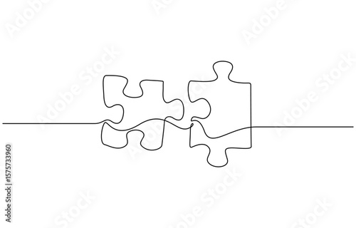 Continuous one line drawing of two puzzle pieces, Two connected puzzles line art. Jigsaw pieces continuous one line drawing. Vector isolated on white.