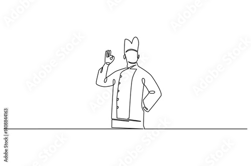 Continuous one line drawing of Young man Chef. Single line drawing illustration of chef with uniform. Hotel and restaurant decoration concept vector art. Doodle line illustration.