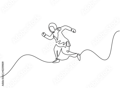 Continuous one line drawing young Arab female worker jumping high to the sky. Success business manager. Minimalist metaphor concept. Single line draw design vector graphic illustration