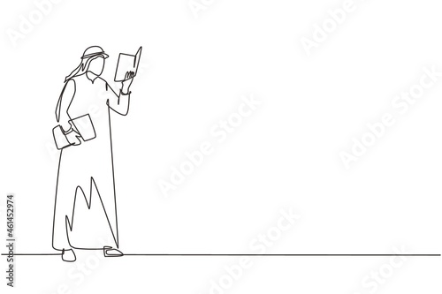 Continuous one line drawing young Arabian man stands and holds book in his hands. Guy reading book. Student in library. Male spending spare time by reading literature. Single line draw design vector