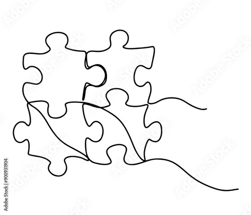 continuous single line drawing of jigsaw puzzle pieces isolated on transparent background. vector illustration