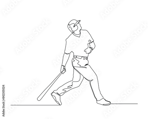 Continuous single line drawing of The batter looks up and sees the ball he hit flying. baseball tournament event . Design illustration