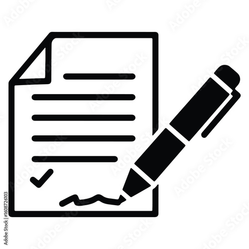 Contract signing icon depicting agreement approval with a pen and checkmark markings