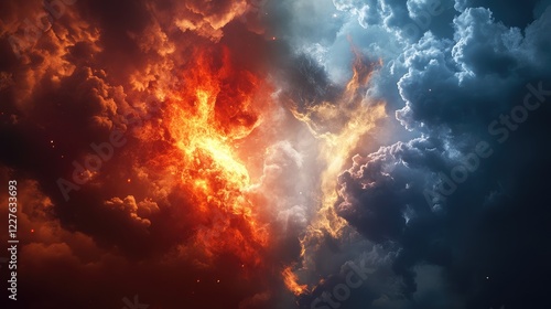 Contrasting elements of heaven and hell depicting fire and clouds symbolizing the battle between good and evil in the afterlife concepts.