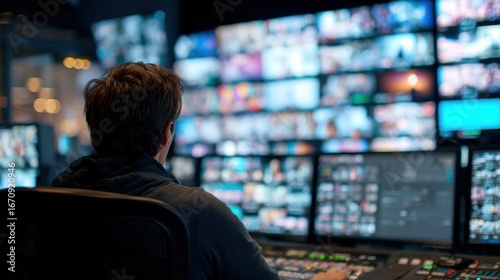 Control room medium shot highlighting an analyst managing livestream shopping inventory sync illuminated by digital overlays with the peripheral area intentionally blurred.
