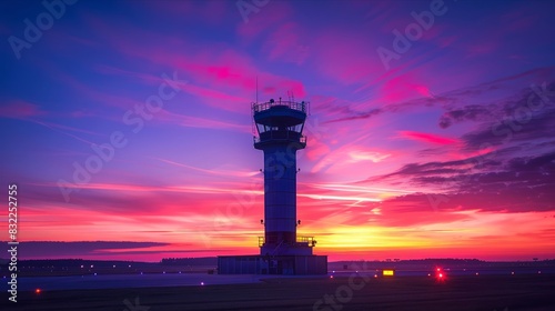 Control tower silhouette against vibrant sunset sky highlighting aviation