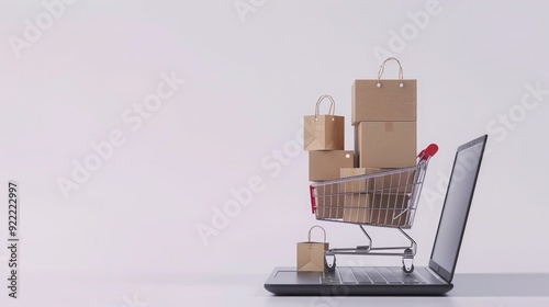 Convenient Online Shopping: Cart Full of Boxes on Top of Laptop Computer, Illustrating the Concept of E-Commerce and the Ease of Online Purchasing.