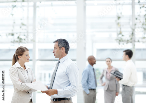Conversation, teamwork and business people in office, documents and help with report. Employees, coworkers or lawyers with brainstorming, guidance or planning. with professional, chatting or feedback