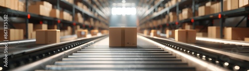 Conveyor belt in a distribution warehouse with rows of cardboard boxes, metallic textures, detailed, realistic illustration