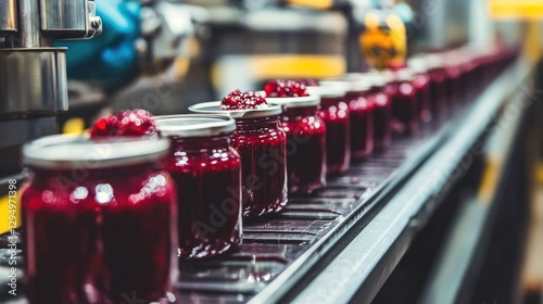 Conveyor Belt of Jars Filled with Red Berry Jam in a Food Processing Factory