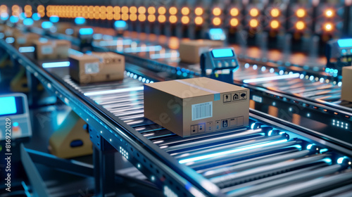 Conveyor belt system in a high-tech warehouse, transporting packages with barcodes and labels. Automated sorting process with illuminated blue lights and blurred background.