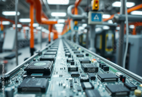 Conveyor system transports printed circuit boards with advanced processing units at an electronics factory during operational hours.