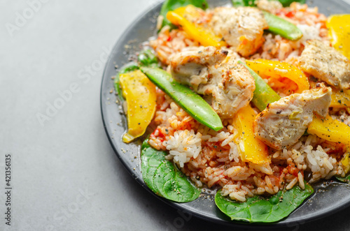 Cooked chicken breast pieces with peppers, sugar snap peas, and baby leaf spinach in a spicy sweet and sour sauce with fragrant rice
