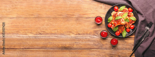 Cooked chicken wings with vegetables and sauce on wooden background with space for text