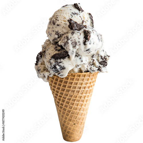 Cookies and cream ice cream in crispy cone on transparent background