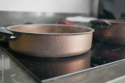 cooking pan on electric stove, electric stove is heated to red.