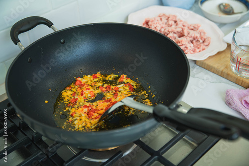 Cooking stir-fried pork and basil, Thai food. Stir-fried with minced pork and basil on plate.