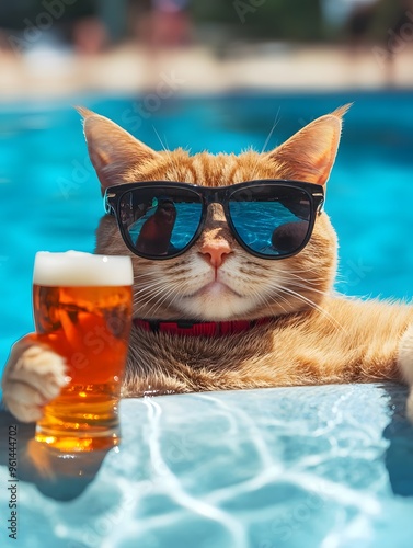 Cool Cat in Sunglasses Holding Beer by the Pool