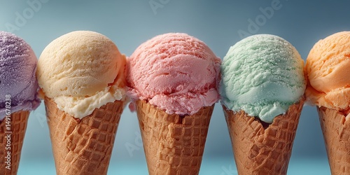 Cool Cones Array: A close-up shot showcasing an array of vibrantly colored ice cream cones, each a testament to the refreshing sweetness and sensory experience of the moment.